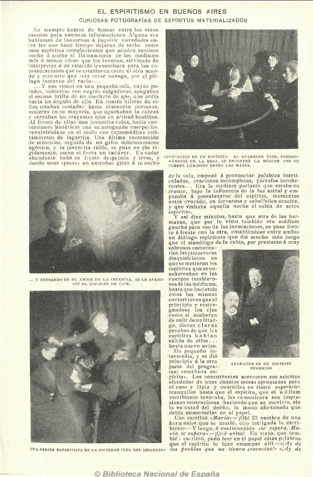 Otro medio que divulgaba en sus páginas sobre estos temas era el semanario Caras y Caretas, en donde se publicó en 1904 una nota titulada “El espiritismo en Buenos Aires. Curiosas fotografías de espíritus materializados”. El cronista presencia una sesión espiritista en la sociedad “Luz del desierto” dedicada a estos temas y narra sobre el trance de una médium poseída por un espíritu, demostraciones de escritura espírita y muestra imágenes de espíritus que rodean a las personas presentes.