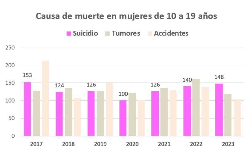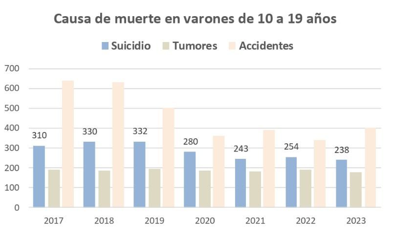 Al menos como aproximación, lo que puede decirse del gráfico 1 de los datos a nivel global es que no hay una tendencia marcada en aumento recién desde 2010 en Sudamérica. En cualquier caso, lo que sí podría decirse es que desde la década del 90 la tendencia va levemente en aumento. Pero también si miramos los datos en Argentina desde 2017 a 2023 lo que se encuentra es un relativo estancamiento: un aumento en suicidios por parte de mujeres a partir de la pandemia pero un decrecimiento en el número en los varones. Haidt toma para sus hipótesis los datos de Estados Unidos, que son los que se ven en el gráfico 1 y en los que sí hay una marcada tendencia en aumento desde 2010. Sin embargo, al hacer una valoración más general, se puede decir que los datos no marcarían ese punto de inflexión que marca Haidt y que es lo que retoma Ofelia. Esta es una de las fuertes críticas que se le realiza a Haidt con respecto a la utilización maniqueísta de los datos para sostener sus ideas.