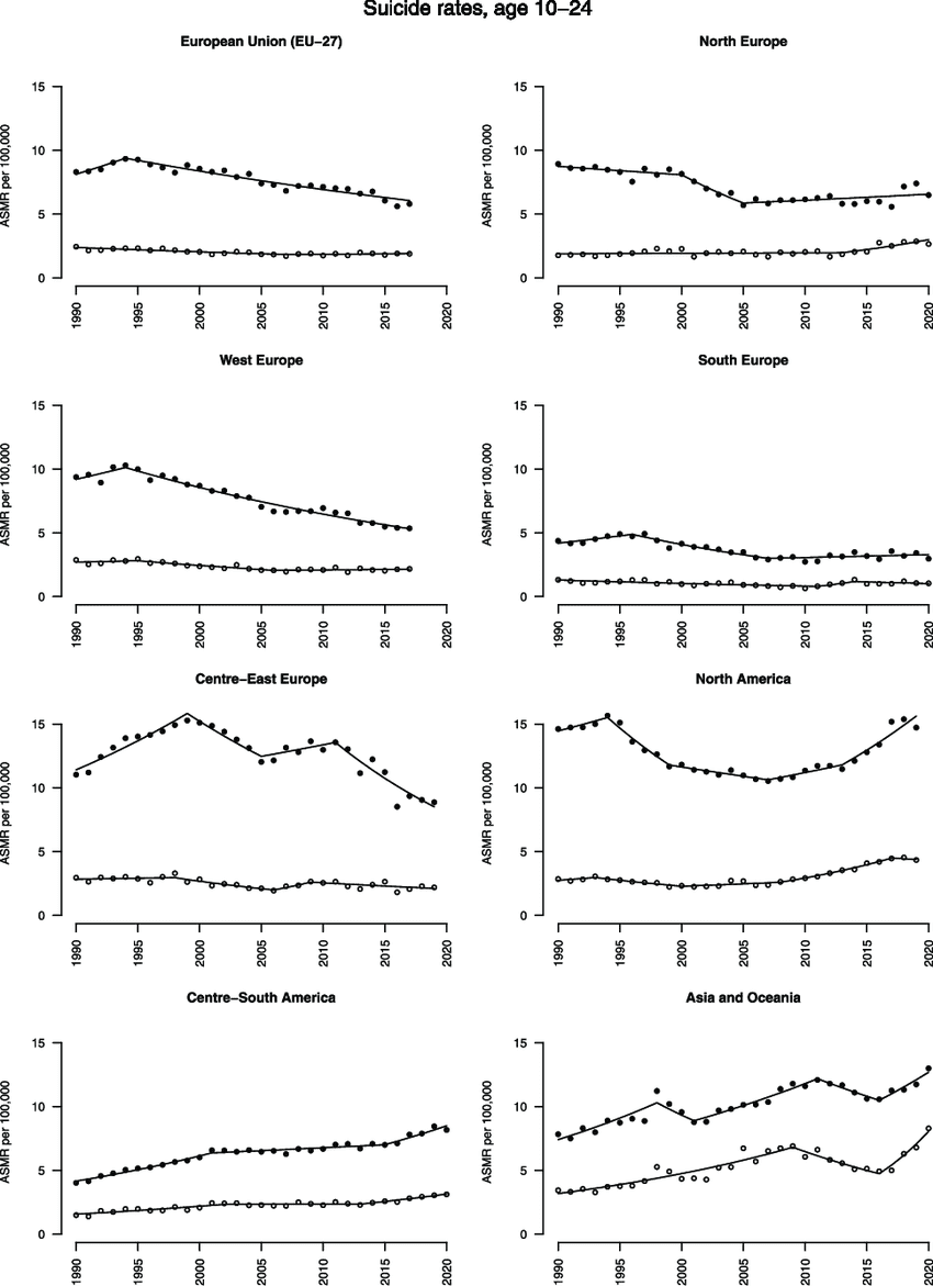 Estos son en gran parte los datos y argumentos sobre los que basa su lectura Ofelia en su documental para dar cuenta de una problemática generacional. Al finalizar el video, menciona también que no hay datos sobre salud mental en Argentina, que los que hay son insuficientes, fragmentados y discontinuos. Más allá de las críticas que se le pueden hacer a Haidt, sobre lo que cabe detenerse también, me interesa en primer lugar detenerme sobre los datos que sí hay en Argentina. Al menos en lo que respecta sobre suicidios, no es cierto que en Argentina no haya datos. A continuación, dejo imágenes de los datos que encontré respecto al tema: un gráfico de los datos a nivel global y otros dos de Argentina divididos por género (estos últimos de un informe del Observatorio del Desarrollo Humano y la Vulnerabilidad de la Universidad Austral).