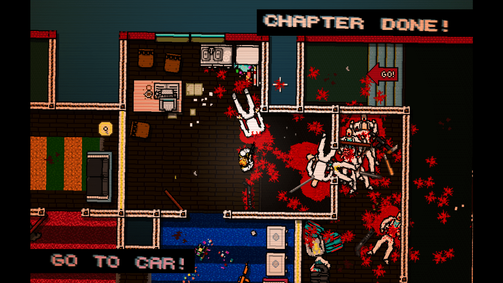 Hotline Miami logra meter al jugador en un trance de frenetismo y violencia. La vista cenital que nos ofrece está pensada para que el jugador planifique cómo va a realizar la masacre. Uno decide si prefiere ir a melee de manera más sigilosa, entrar directo a los tiros (mi opción preferida en todos los juegos) o ir cambiando entre una cosa y otra. Cuánto más rápido logres la matanza y más variedad tengas a la hora de matar, lográs desbloquear más cosas.